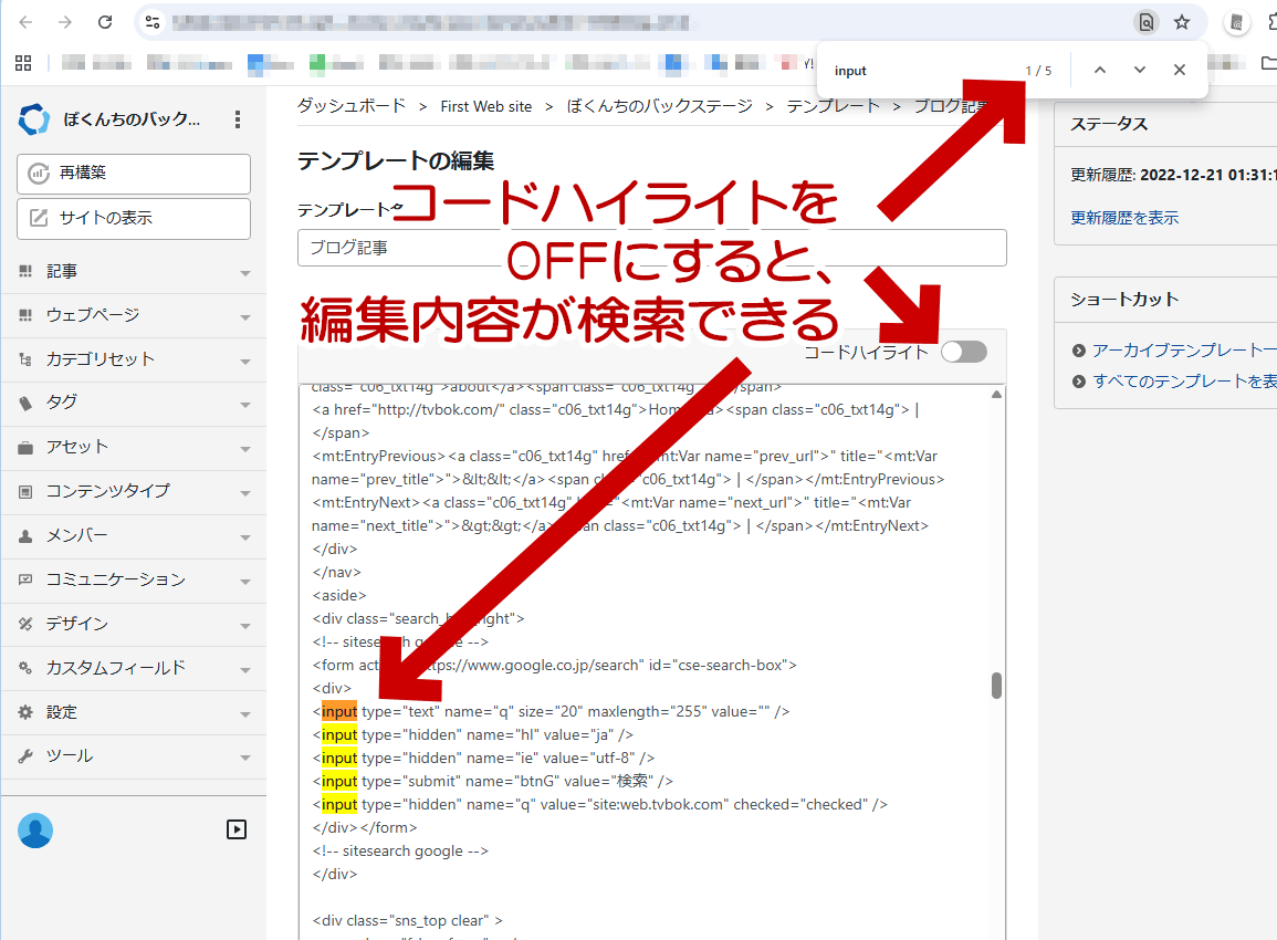 Movable Type 7 で「テンプレート編集」画面を開き、Ctrl + F (MacはCommand + F) でページ内検索をする場合、「コードハイライト」を無効にしないと「ページ内検索」が無効になるのだ。(ちなみに Google Chrome を使用)