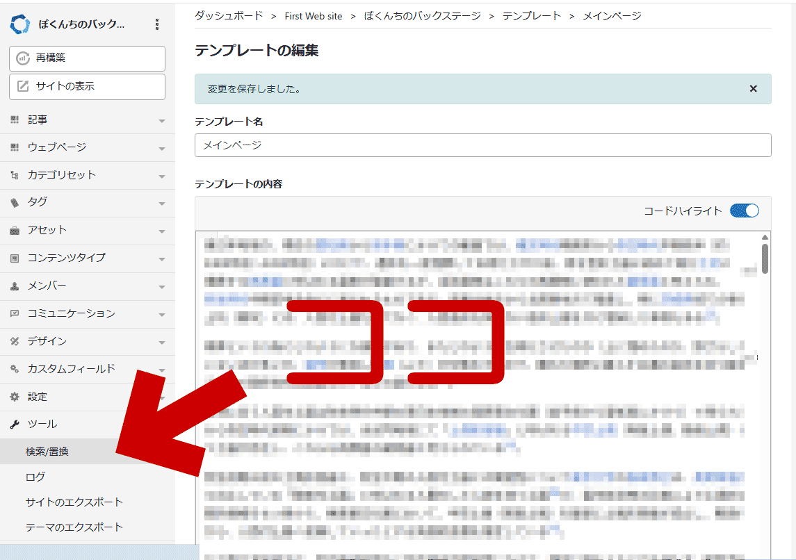 左の一番下の「ツール」をクリックすると、その中に「検索・置換」が出てくる。