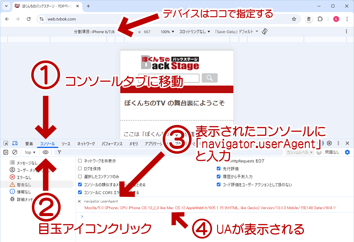 - Developer Tools のコンソールに 「console.log(navigator.userAgent);」と javascript 形式で書く方法もある。しかし、こちらは延々とログが垂れ流されるので、お勧めしない。