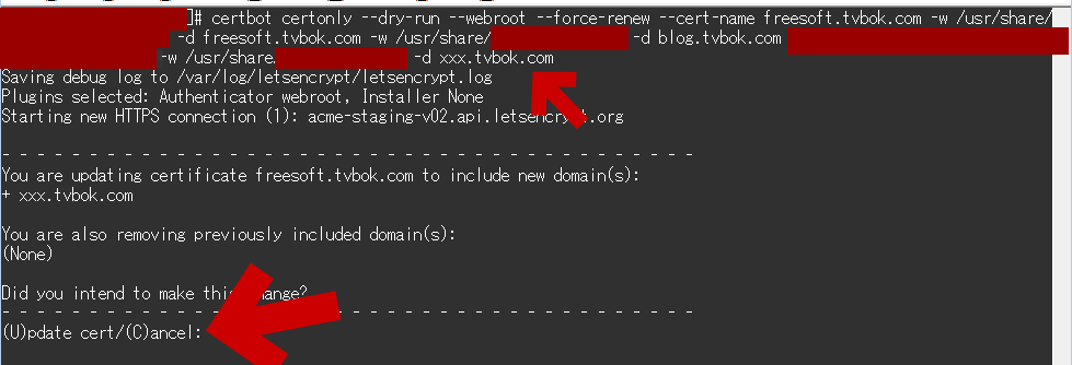 certbot certonly --dry-run --webroot --force-renew --cert-name freesoft.tvbok.com -w /usr/share/nginx/html/freesoft -d freesoft.tvbok.com -w /usr/share/nginx/html/blog -d blog.tvbok.com -w /usr/share/nginx/html/hoge -d hoge.tvbok.com - 分かりやすく改行